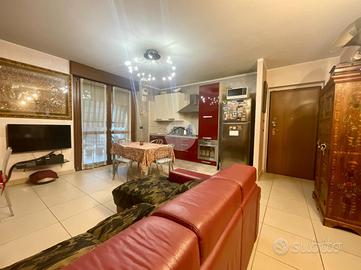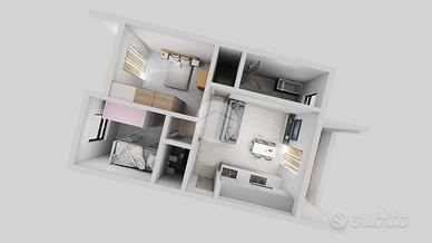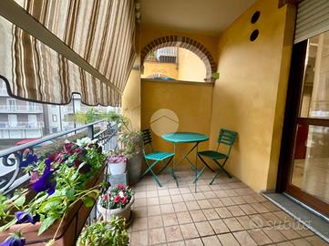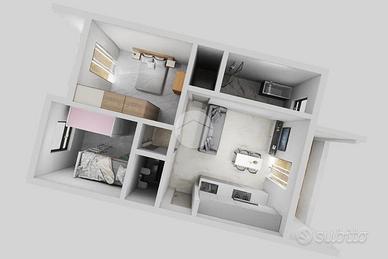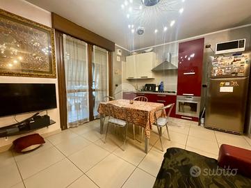 Ampio ingresso living con parete cucina attrezzata a vista. L'ambiente è reso estremamente luminoso da una porta finestra che conduce al terrazzo, spazio ideale per pranzi all'aperto e momenti di relax. La zona notte è composta da due camere da letto una con finestra, l'altra con accesso diretto a un balcone tramite porta finestra.