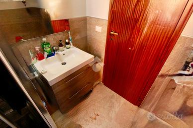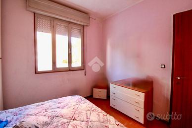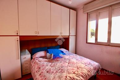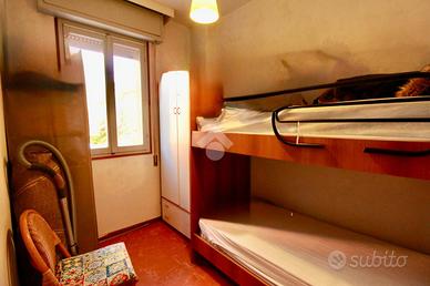 Dalla zona giorno, attraverso una porta, entriamo nel disimpegno della zona notte, nella quale troviamo una camera da letto matrimoniale, il bagno (di recente ristrutturazione) finestrato con box doccia e doppi servizi, ed un'ultima camera da letto singola, con letto a castello. Completano la proprietà un condizionatore in pompa di calore e gli infissi, in legno e vetro semplice.