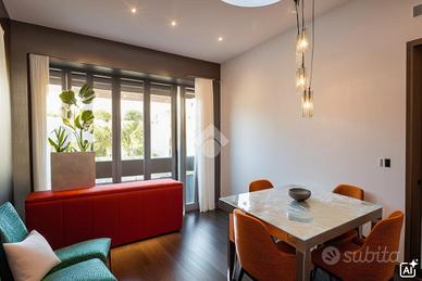 Accedendo all'appartamento dopo aver utilizzato l'ascensore e/o vano scale condominiale, ci troviamo nel disimpegno di ingresso dell'immobile, dove, subito sulla destra, abbiamo la cucina completa con piano a induzione e, frontalmente al disimpegno, vi si trova la zona giorno, composta da divano per tre persone, mobile tv, tavolo da pranzo per quattro persone e l'accesso al terrazzo. Quest'ultimo è ampio e comodo per poter pranzare/cenare all'esterno.