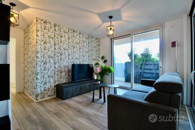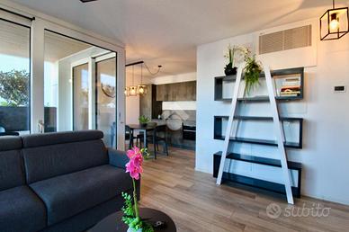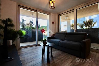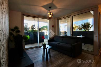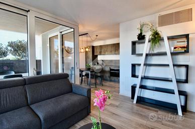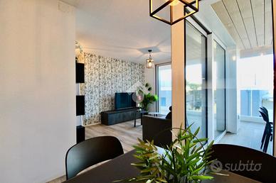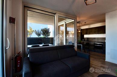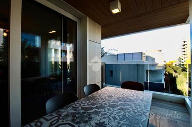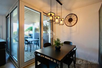 Dalla sala da pranzo, accediamo direttamente all'ampio terrazzo che costeggia l'appartamento nel lato Est, trovandoci, prima, in un portico riparato ove è presente una seconda zona, dotata di tavolo e sedie, ove poter pranzare all'aria aperta, rilassarsi o inserire una comoda vasca idromassaggio.