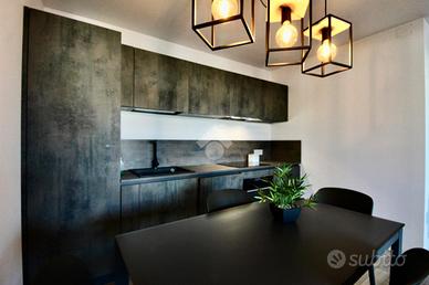 La cucina lineare, in tonalità grigio scuro - antracite, è dotato di piano cottura a induzione, lavabo, frigorifero con freezer, forno e lavastoviglie.
