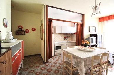 accediamo all'unità abitativa mediante un portoncino ligneo trovandoci nell'ambiente dedicato al pranzo e soggiorno, completo di angolo cottura in nicchia, finestrato.