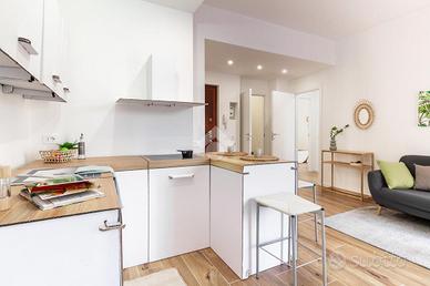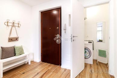 All'interno di una signorile palazzina recentemente ristrutturata nelle parti comuni, servita da ascensore fino al piano cantina, l'ingresso dell'abitazione da accesso alla zona giorno luminosa e accogliente, caratterizzata da una cucina a vista angolare perfettamente integrata e una zona living progettata per il relax quotidiano.
