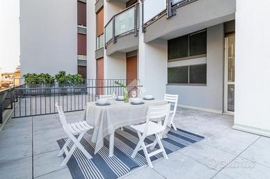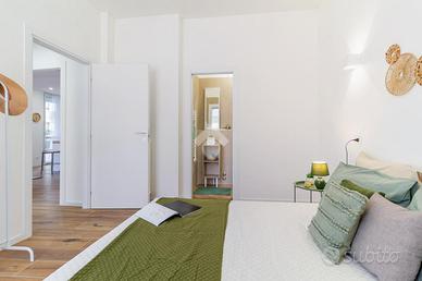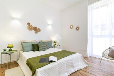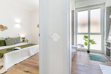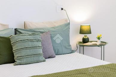 La zona notte, collegata dal disimpegno, ospita due camere matrimoniali, la camera padronale è dotata di bagno privato con doccia, mentre la seconda camera si affaccia direttamente sul terrazzo, regalando luce e continuità tra gli ambienti. Il bagno principale è finestrato, munito di ampia doccia rivestita con piastrelle di tendenza e dei sanitari sospesi.