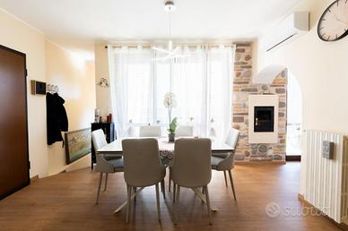 L'ingresso dà accesso alla luminosa e piacevole zona giorno, uno spazio ben distribuito dove l'area relax e la zona pranzo convivono in perfetta armonia. La cucina, separata da un elegante arco che valorizza gli ambienti mantenendoli distinti, risulta funzionale e ben organizzata. Il termocamino a legna dona carattere e atmosfera, rendendo l'ambiente particolarmente accogliente.