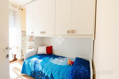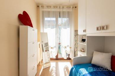 La zona notte ospita una comoda camera da letto matrimoniale, uno studio ideale anche come cameretta e un bagno finestrato moderno e raffinato, completo di ampia doccia, sanitari sospesi e termoarredo.