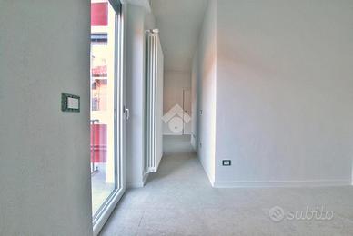 La soluzione è situata al primo piano. Già dalla scala comune si possono notare gli elementi di ristrutturazione innovativi e di design; le luci led applicate su ciascun pianerottolo consentono un'illuminazione perfetta anche di sera, facilitando l'ingresso in ciascuno degli appartamenti. La porta d'ingresso blindata si apre sul soggiorno, la cucina è abitabile e consente lo sfogo sul primo dei due balconi che ospita il vano caldaia con affaccio sul retro. Il vano disimpegno separa la zona giorno dalla zona notte, favorendo privacy e tranquillità. La camera da letto è luminosa, con spazio dedicato per lo smart working. Inoltre, per rendere la camera spaziosa e funzionale, è stato ricavato un vano adibito a comoda cabina armadio, con porta scorrevole a specchio salvaspazio. La porta finestra consente di accedere al balcone angolare che, affiancato dalla finestra, favorisce un migliore ricircolo d'aria. Per il bagno è stata progettata l'installazione di una doccia moderna fuori misura, per garantire il massimo comfort in uno dei momenti più rilassanti della giornata, i sanitari sono sospesi, per agevolare la pulizia degli interni, e la rubinetteria è a risparmio energetico. Infine, il termoarredo presente riprende lo stile moderno dei sanitari. Inoltre, al fine di rendere più agibili i servizi, è stato ricavato un vano a sé stante da adibire esclusivamente a zona lavanderia/ripostiglio, con gli allacci per la lavatrice e lo spazio necessario per l'installazione di un'as.