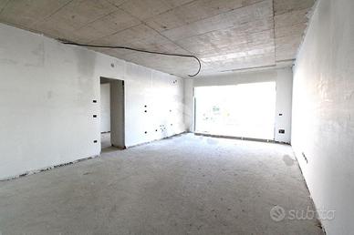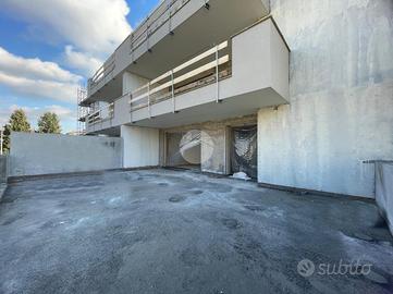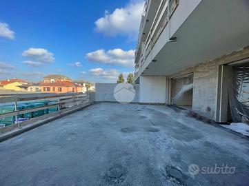L'ingresso avviene nella luminosa zona giorno open space con angolo cottura, caratterizzata da un'ampia vetrata che affaccia sul terrazzo vivibile di 70 mq.