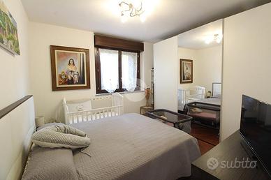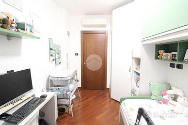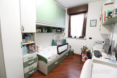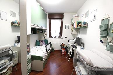 Tramite il disimpegno armadiato su misura si accede alla zona notte dove troviamo la camera matrimoniale, la cameretta e il bagno finestrato accessoriato dal box doccia.
