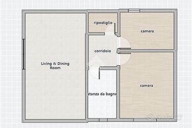 L'immobile si distingue per un'ampia zona living con cucina integrata, due camere da letto, una matrimoniale con accesso al giardino retrostante e l'altra doppia con finestra.