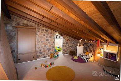 Al primo piano troviamo la cucina abitabile, un grande soggiorno con camino, un servizio e una comoda camera da letto.