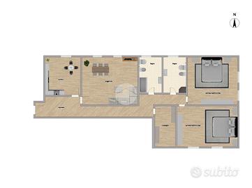 L'appartamento dalle generose metrature è composto da: pratica cucina separata; zona giorno spaziosa e luminosa, arredabile con set composto da tavolo e sedie e comoda area relax arredabile con doppi divani. Attraverso il corridoio si accede alla zona notte composta da: due spaziose camere da letto matrimoniali; il primo bagno finestrato con box doccia e secondo bagno finestrato con comoda vasca da bagno.