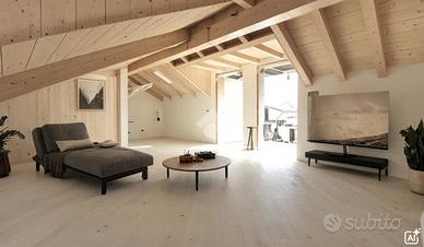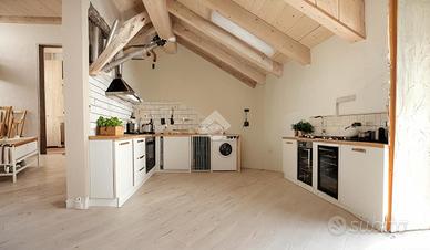 Il piano mansardato e caratterizzato dalle travi a vista è così composto: un'ampio open space suddiviso in zona relax/living e zona cottura, oltre ad un bagno con box doccia.
