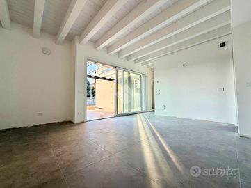 Entrando, ci accoglie una luminosa e spaziosa zona living di 55 mq con angolo cottura, caratterizzata da ampie porte finestre che illuminano l'ambiente e si aprono sul giardino privato, ideale per momenti di relax all'aria aperta.