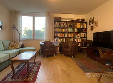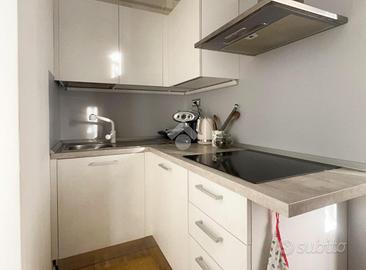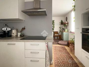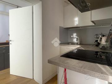 Dall'ingresso condominiale si accede alla luminosa sala da pranzo con cucinotto separato. Sulla destra è presente una stanza attualmente utilizzata come salotto, ideale anche come studio o seconda camera da letto.