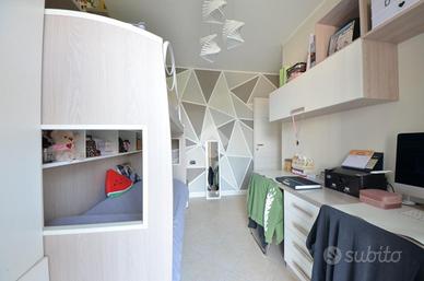 Un comodo disimpegno, separa la zona giorno dalla zona notte, dove troviamo un bagno finestrato con box doccia, la cameretta con accesso al balcone, da cui è possibile accedere anche dalla camera matrimoniale, dotata di bagno privato con box doccia.