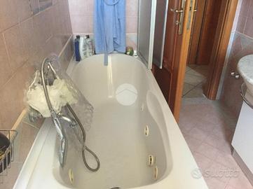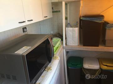 Dall' ingresso si accede ad una zona living con ampio salone, cucinotto, un disimpegno, due camere da letto, due bagni, di cui uno in camera ed un balcone verandato.