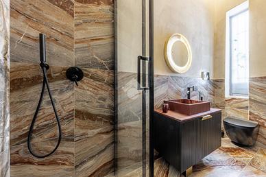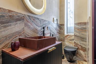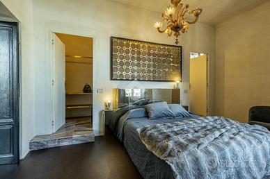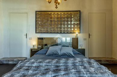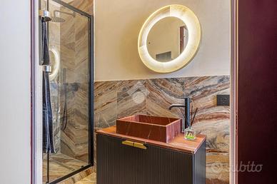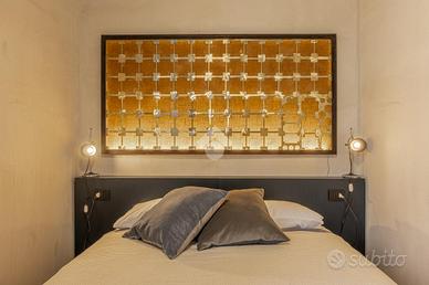 Dettagli di lusso e design Le camere da letto, veri e propri rifugi di tranquillità, sono arredate con pezzi unici, come la testata del letto matrimoniale realizzata con specchi di recupero del 1800 e l'opera luminosa site-specific in ottone, juta e vetroresina. I bagni, con i loro lavabi in rosso Francia e i sanitari nero opaco, sono un'ode al lusso e alla raffinatezza.