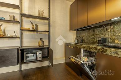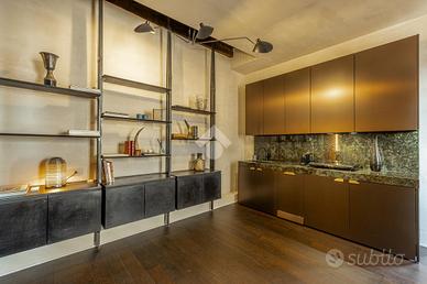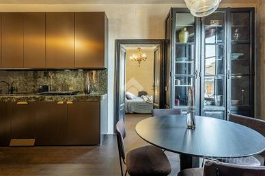 Un'oasi di comfort e stile Ogni dettaglio è stato curato con la massima attenzione, dai pavimenti in pregiato parquet di rovere trattato ad olio, posato alla lombarda, ai marmi arabescati orobici che rivestono i bagni, creando un'atmosfera di raffinata eleganza. La zona living, inondata di luce naturale, è un invito al relax, con i suoi divani color miele, la libreria in legno e ferro ispirata agli anni '50 e il tavolo da pranzo disegnato da Ignazio Gardella. La cucina, un capolavoro di acciaio bronzato e granito brasiliano, è un connubio perfetto tra funzionalità e design.