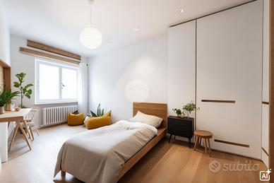 Sul lato destro del corridoio si sviluppano invece il soggiorno e la camera matrimoniale, entrambi affacciati su Via Pietro da Cemmo, godendo di buona esposizione e ottima lum