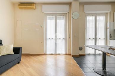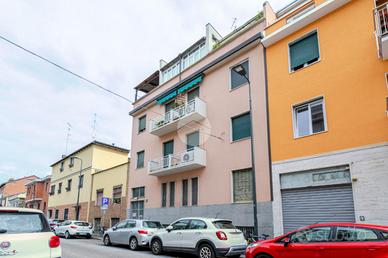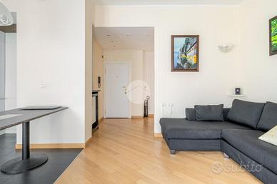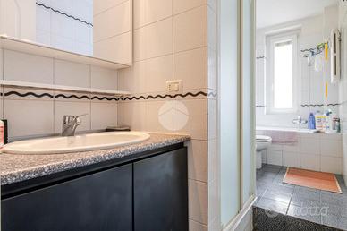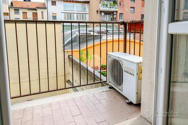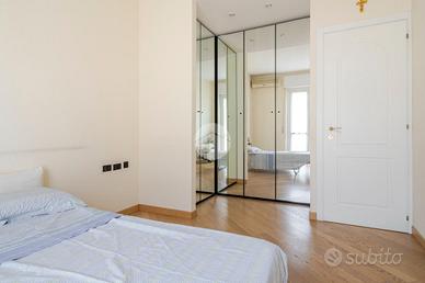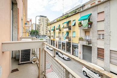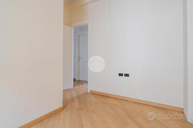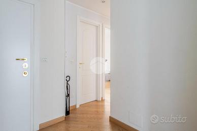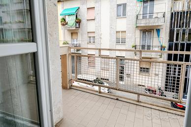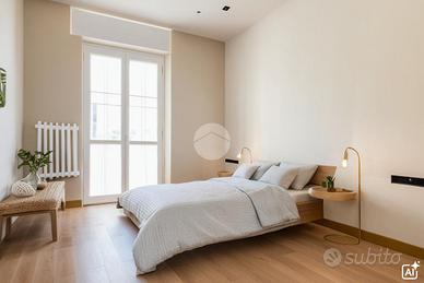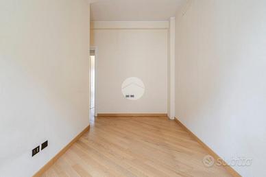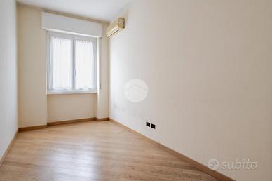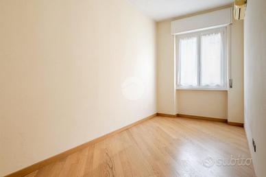 Ingresso in ampio disimpegno che si apre subito nell'ampia e luminosa zona living con moderna cucina a vista e doppia porta finestra che ci consente l'accesso al balcone con piacevole affaccio su Via Alunno. A seguire tramite il disimpegno accediamo alla zona notte dove, con medesima esposizione della zona living, troviamo la camera singola, mentre con esposizione contraria, quindi con silenzioso affaccio su corte interna, troviamo la camera matrimoniale con balcone e infine il bagno finestrato con vasca.