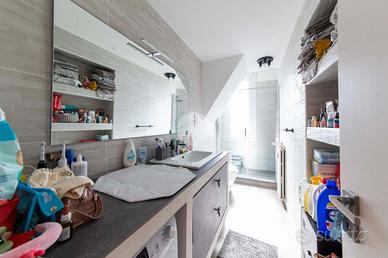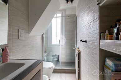 Ritornando nella zona giorno, esposizione opposta, si accede alla spaziosa camera matrimoniale, anch'essa con piacevole affaccio su un altro lato del cortile condominiale e con cabina armadio, pensata ad offrire uno spazio dedicato alla cura del proprio stile. Completa la proprietà un secondo bagno, finestrato e con box doccia, anch'esso con la stessa esposizione della zona living.