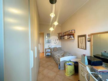 La zona notte è ben distribuita e comprende una spaziosa camera matrimoniale climatizzata, una seconda camera ideale come cameretta o studio, un bagno finestrato con ampia doccia idromassaggio collegata al balcone e una comoda zona lavanderia, anch'essa finestrata.