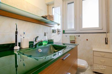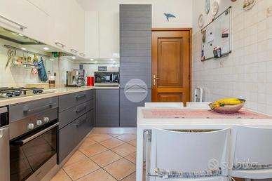 Con esposizione opposta, troviamo la cucina abitabile, anch'essa luminosa, con balcone che si affaccia sul verde condominiale, ideale per chi ama cucinare con tranquillità e al contempo godersi la vista su un contesto sereno e riservato.