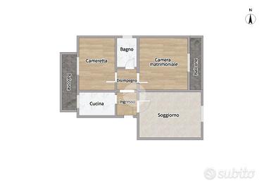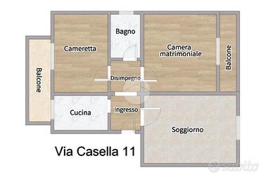 L'appartamento è composto da disimpegno, soggiorno, camera matrimoniale con balcone, bagno finestrato con vasca, cucina semi-abitabile e cameretta con unico acccesso al balcone.