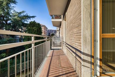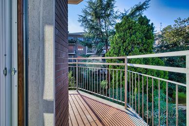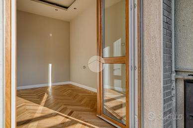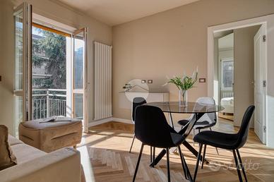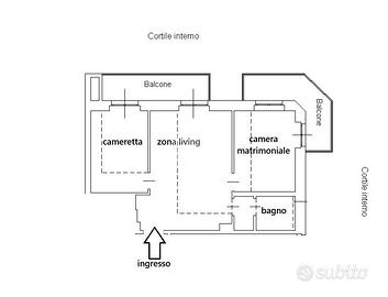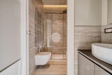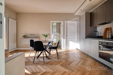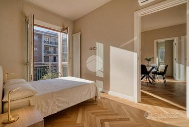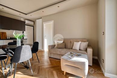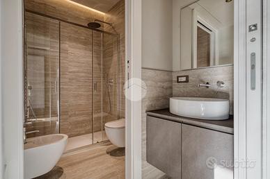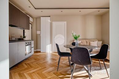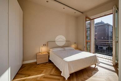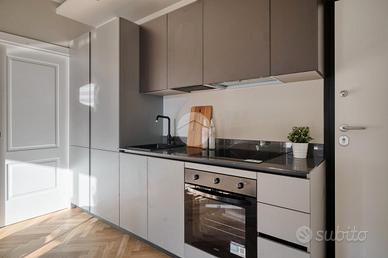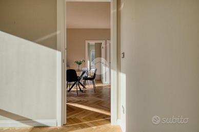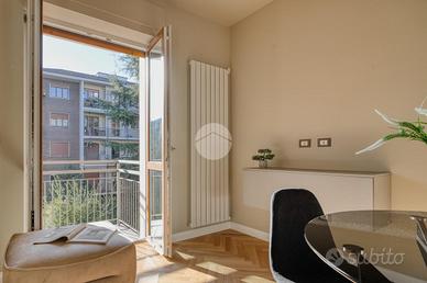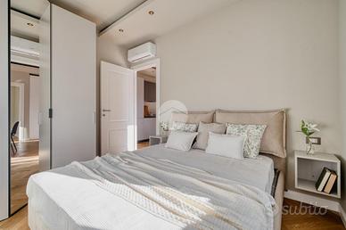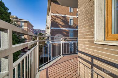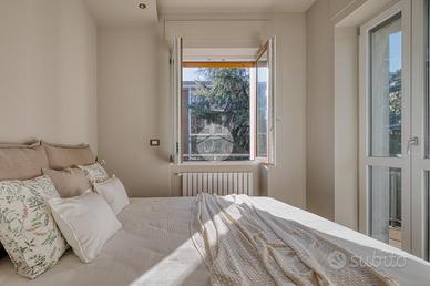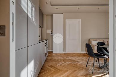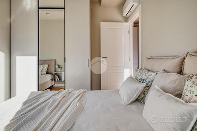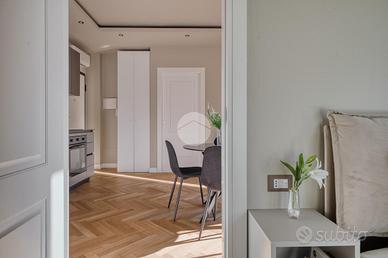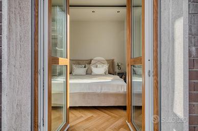 L'ingresso si apre su una spaziosa e luminosa zona living, caratterizzata da una cucina a vista, realizzata su misura dal marchio Aran, e completa di elettrodomestici di alta gamma: piano cottura a induzione, cappa integrata e lavastoviglie. La cucina è arricchita da una porta finestra che conduce al primo ampio balcone, con un affaccio sereno e riservato sulla corte interna. Proseguendo, sulla destra, si trova la generosa camera matrimoniale, dotata di accesso al secondo balcone, che si sviluppa in modo regolare sia in larghezza che in lunghezza, offrendo la possibilità di inserire un tavolino e delle sedie per godere della vista tranquilla. A sinistra della zona living, si trova la seconda camera matrimoniale, anch'essa molto luminosa, che beneficia di un accesso diretto al medesimo balcone della zona giorno. Completano la proprietà un e