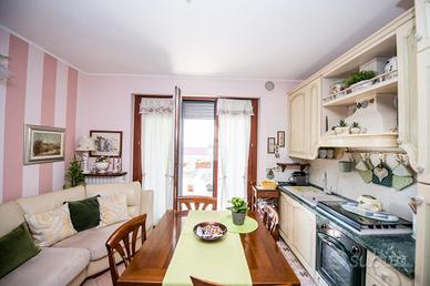 L'appartamento si compone di un soggiorno con cucina a vista e accesso diretto a un ampio balcone vivibile, perfetto per pranzi e momenti di relax all'aperto. La zona notte include due camere da letto e un bagno finestrato.
