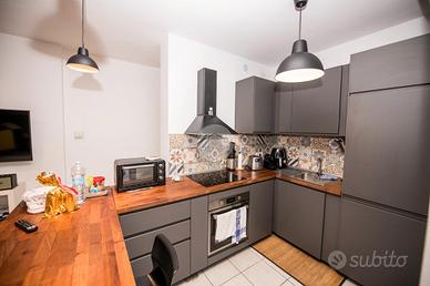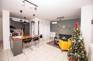 Con una superficie di circa 80mq, l'appartamento si apre su un accogliente soggiorno con cucina a vista, ideale per trascorrere momenti di convivialità.