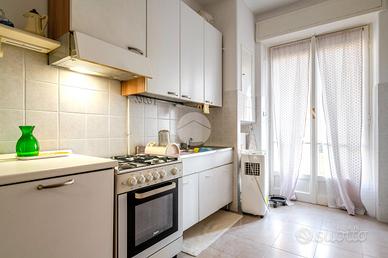L'appartamento si apre su un ingresso con disimpegno che conduce all'ampio soggiorno, luminoso grazie alla doppia porta finestra che permette l'accesso al primo dei tre balconi, con affaccio sulla via principale. La cucina è separata e dispone dell'accesso diretto al secondo balcone, con affaccio interno; la pavimentazione della cucina è in ceramica, in continuità con le finiture del bagno.