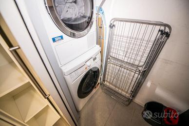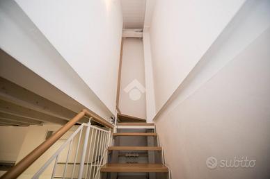 Al piano inferiore si sviluppa una luminosa zona living, impreziosita da travi in legno a vista che conferiscono calore e carattere all'ambiente. La cucina, dal design moderno e funzionale, si fonde armoniosamente con la zona giorno, completata da un pratico angolo lavanderia ricavato sotto la struttura di collegamento tra i due piani.