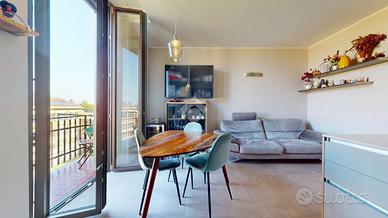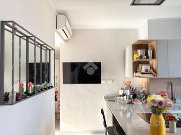 L'ingresso si apre sul soggiorno con cucina a vista Scavolini, realizzata su misura e dotata di cappa integrata nel controsoffitto. Il soggiorno affaccia su un balcone tranquillo con vista aperta.