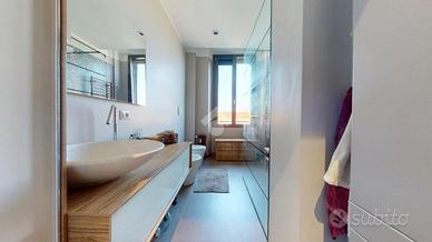 Il bagno è moderno, con doccia walk-in e arredo su misura.