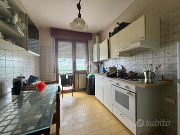 MISANO DI GERA D'ADDA: TRILOCALE Ampio appartamento ubicato al piano rialzato servito inoltre da ascensore. La casa si presenta con spazi abitativi generosi e si presta per chi predilige le grandi abitazioni, gode infatti di ingresso , salone con uscita sul primo terrazzino, cucina abitabile anch'essa con uscita sul secondo terrazzino. Zona notte servita invece da corridoio armadiabile, due comode camere matrimoniali sempre con uscita sui terrazzini e per ultimare, bagno padronale con doccia. La proprietà è inoltre servita di cantina e di box.