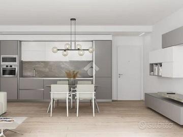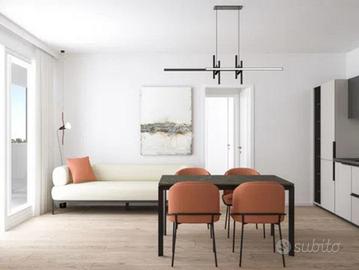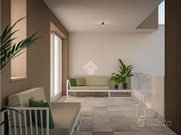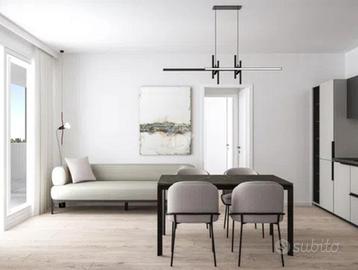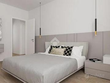 Il trilocale presenta una luminosa zona giorno con soggiorno e cucina open space, dalla quale si accede a un ampio terrazzo ideale per godersi gli spazi esterni. La zona notte comprende una camera matrimoniale di 14 mq e una camera singola di 12 mq; dalla matrimoniale è possibile uscire direttamente sul terrazzo. Completano il reparto notte un ripostiglio adiacente al disimpegno e due bagni dotati di doccia.