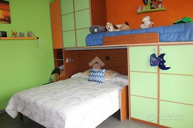 MOMO: Porzione di bifamiliare posta al primo piano con giardino privato. La zona giorno è composta da un ampio salone ed una cucina abitabile con balcone. Nella zona notte sono presenti due camere da letto matrimoniali ed un bagno con doccia e finestra. Completa la proprietà un giardino di c.a 400 mq in cui sono presenti due box auto ed un deposito, e due ingressi completamenti privati. Completamente ristrutturata nel 2010.
