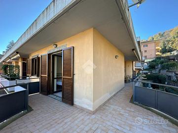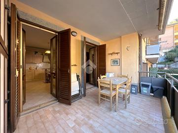 L'appartamento si apre su un ampio soggiorno con angolo cottura, ambiente accogliente e funzionale con accesso diretto al terrazzo esterno, ideale per vivere momenti all'aperto.