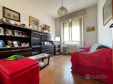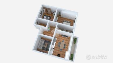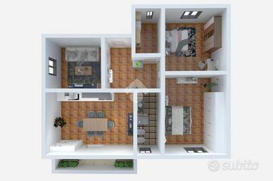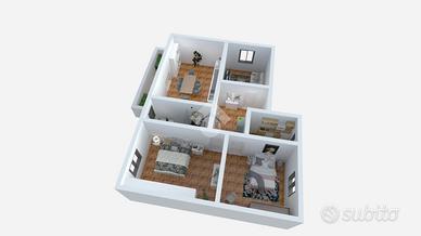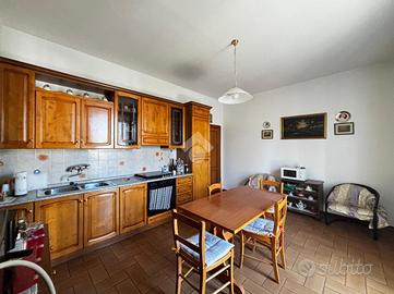 Si entra nell'ingresso, dal quale si accede a tutte le stanze della casa: un accogliente soggiorno, separato dall'ampia cucina abitabile con terrazzo, un ripostiglio, bagno finestrato con doccia e due spaziose camere da letto matrimoniali.