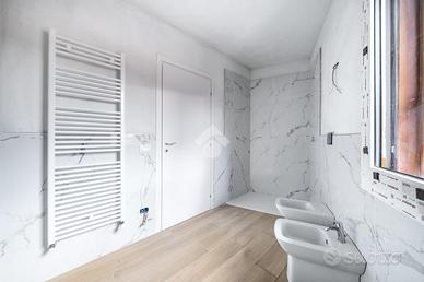 La zona notte si compone di due camere da letto - tra cui la padronale con bagno privato - e presente un ulteriore servizio finestrato con ampio box doccia.