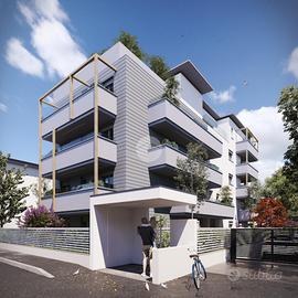 Entrando nella soluzione si ha accesso all'ampia ed elegante zona giorno accesso diretto al terrazzo di circa 44mq tramite una grande vetrata scorrevole che permette alla luce naturale di illuminare l'appartamento. La cucina rimane separata per un maggior comfort e la zona notte è ben distribuita e composta da due camere da letto di ampie dimensioni per garantire al meglio tranquillità e relax e con accesso diretto al balcone di circa 12mq. Concludono due servizi di pregio che seguono l'eleganza della palazzina e dell'appartamento.