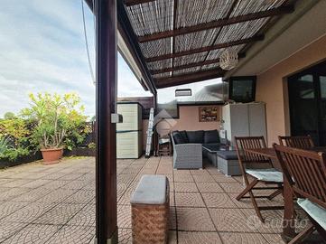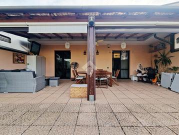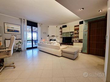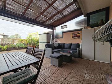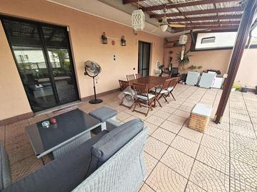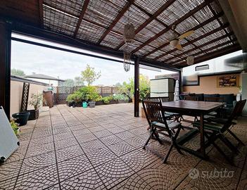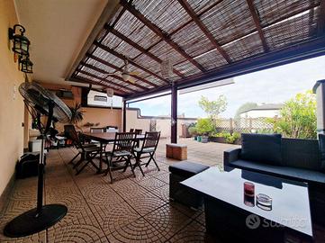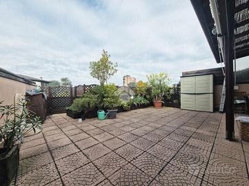 In posizione ottimale per raggiungere Monza, proponiamo prestigioso appartamento posto all'ultimo piano impreziosito da un godibile terrazzo di 75mq. L'immobile si presenta in ottimo stato interno con finiture di alto standard qualitativo: impianto fotovoltaico con lastrico solare di proprietà, impianto domotico con tapparelle motorizzate elettriche, aria condizionata canalizzata e impianto di antifurto. L'ingresso è sull'ampio e luminoso soggiorno caratterizzato dal camino a pellet mentre la cucina abitabile dispone di uscita sul pratico balcone. Il disimpegno, valorizzato da un comodo abbassamento strutturale utilizzabile come ripostiglio, collega la zona notte dove sono presenti la camera da letto matrimoniale, la cameretta in grado di ospitare due letti singoli, un bagno di servizio e un bagno padronale rivestito con ceramiche moderne e completo di vasca e doccia. Possibilità di due box singoli ad Euro 18.000,00 ciascuno.