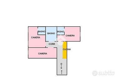 Attualmente cosi composta; Ingresso in disimpegno con cucina, tre camere da letto e tre bagni.