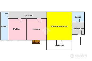 L'immobile è di tre vani suddivisi in un ampio soggiorno-cucina con terrazzo a livello, due bagni, cameretta con finestra, ed infine, camera da letto con uscita sul terrazzo..