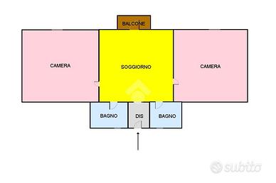 L'appartamento è composto da un disimpegno, due bagni, di cui uno dotato di vasca e l'altro dotato di piatto doccia, due camere da letto, ed infine, un ampio soggiorno-cucina con balcone.