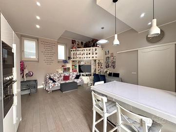 La superficie calpestabile di circa 89 metri quadri è stata sapientemente distribuita. L' ingresso in soggiorno living con angolo cottura ha ben 3 punti luce, ovvero due finestre e un balcone che arieggiano e illuminano la zona giorno; studiolo in soppalco amovibile ricavato grazie a una particolare parete attrezzata, bagno finestrato con ampio box doccia. La zona notte si compone di camera da letto matrimoniale con una capiente cabina armadio annessa e cameretta, entrambe le stanze sono collegate da una balconata doppia con esposizione esterna. Questa proposta immobiliare gode di doppia esposizione angolare che la rende soleggiata e luminosa, ideale per chi cerca una soluzione 'chiavi in mano'.
