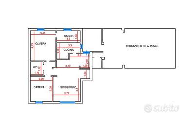 Varcando la soglia d'ingresso, ci accoglie un soggiorno di circa 28 mq, con cucinotto separato. Dal soggiorno si accede al terrazzo di circa 65 mq.