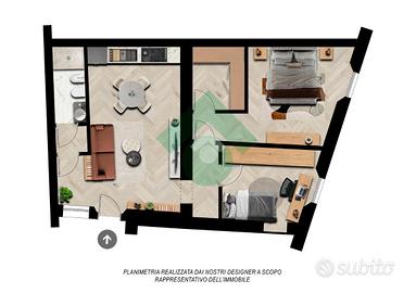 La disposizione interna prevende una zona soggiorno con cucina a vista, bagno con grande doccia e disimpegno, camera matrimoniale con cabina armadio e camera singola.